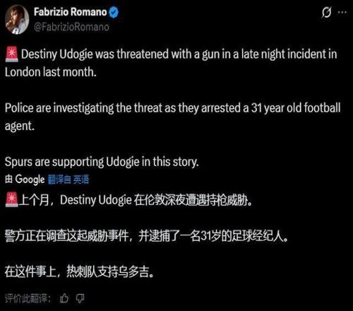 但在今日,托特纳姆热刺宣布,他们正在“为乌多基提供支持”,他就是那位“被经纪人持枪威胁”的英超球员。据称,事发时乌多基正与一位朋友走在伦敦一条繁忙的街道上。警方于9月6日晚上11点14分接到报警,伦敦大都会警方已确认已展开全面调查。据称,该经纪人还因涉嫌敲诈和威胁球员的朋友而接受调查。他尚未被起诉,并于9月9日获得有条件保释。