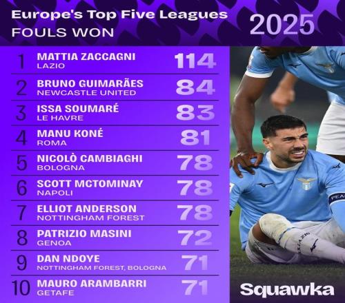 12月31日,据知名数据网站Squawka统计,2025年欧洲五大联赛的被犯规次数榜出炉。拉齐奥前锋扎卡尼以114次高居榜首,纽卡中场吉马良斯84次位列次席。