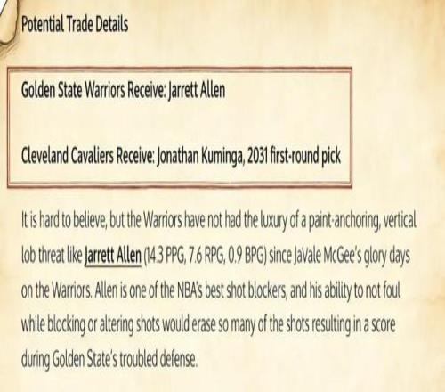 美媒《Fadeaway World》撰文建议,勇士可以将库明加和2031年的首轮签打包送到克利夫兰,换回中锋阿伦。