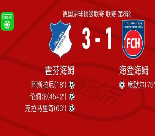 北京时间10月25日德国足球顶级联赛 联赛 第8轮,霍芬海姆主场对阵海登海姆。霍芬海姆阿斯拉尼破门,伦佩尔破门,